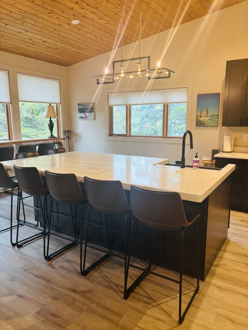 The beautiful deck overlooking mature trees is perfect to enjoy a glass of wine and breath in the fresh air. The modern kitchen is fully equipped.